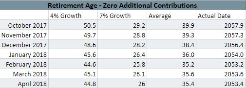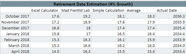 The increased savings rate really has a solid affect on my retirement date when using both the excel calculation and the compound interest formula. Mad fientist must be a little more conservative, I’m guessing it may take an average of my previous savings rates instead. I do feel that strictly using the newest rate is the most accurate though, because I don’t plan on dropping that rate down.