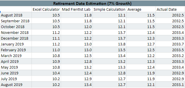 Everything stayed basically the same from July to August, with the Mad Fientist calculator adjusting up again due to spending more than the other two calculations. I’m fine with that though, as a more realistic estimate helps to make sure everything is correct! Still hovering around 16 years for 4% growth and 12 years with 7% growth.