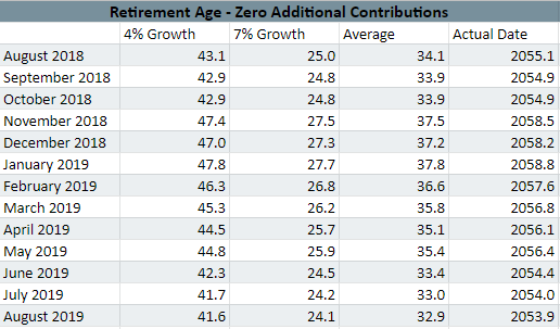 Here is my retirement estimate for August 2019, based on July’s net worth progress. Net worth stayed basically the same from June to July, with a small gain this month. I’m expecting the numbers to stay about the same for the early retirement tracker as well.