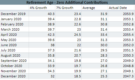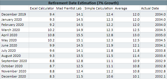 Here is my retirement estimate for December 2020, based on November’s net worth. This is my highest net worth since tracking once again, so I’m looking forward to seeing the numbers!