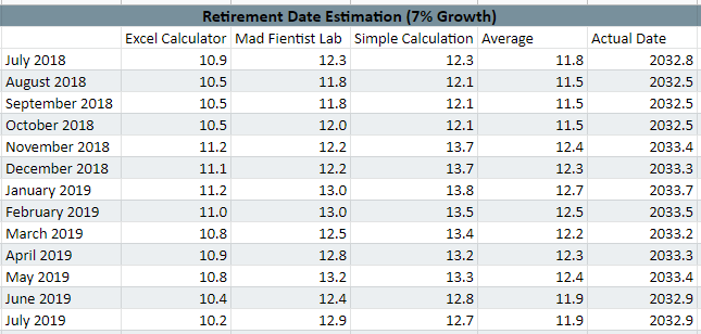 It looks like both estimates stayed about the same, with the 4% growth estimate having a slight jump up to 16 years this month. For some reason, the Mad Fientist calculator really jumped up even with just a small increase in spending! Looking at the 7% growth, the average stayed the same at just under 12 years until retirement.