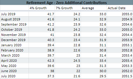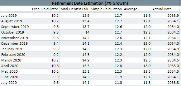Here is my retirement estimate for July 2020, based on June’s net worth. It was another great month for me, so I’m expecting similar results with the estimation dropping.