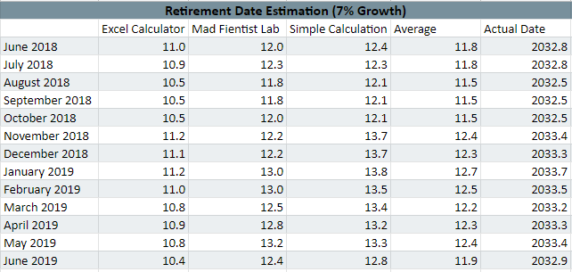 Both calculations based on 4% and 7% saw a decrease of over half a year, and that’s with “only” $13,000 in net worth change. I’m hoping that I continue that pace of saving and growth throughout the rest of 2019 and I push that 7% closer to 11 years.