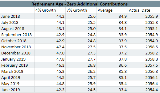 Here is my retirement estimate for June 2019, based on May’s net worth progress. It was another record net worth at $171,036 and that record blew the previous one out by over $13,000. I’m definitely expecting to see a positive impact in the early retirement numbers here, especially with how drastic of a change in net worth I experienced over the past month. I’m hoping that it will rival some of the numbers I was getting last Summer (2018) before I changed the calculation of my spending.
