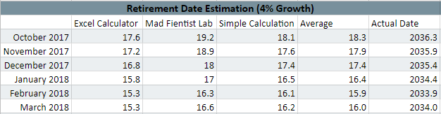 Since this calculation doesn’t take into effect any savings rate, it saw the largest increase in time period. I’m still sitting under 36 years for the time being. The goal is to have this number under 30 years by the end of 2018, and I still believe that is within reach. Hopefully next month’s update will be more positive!