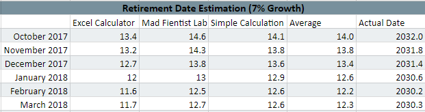 Both calculations saw a slight increase in time until I actually am able to retire, about .1 or a 1-2 month increase. When you consider that my average spending went up last month and my net worth went down by a bit, it’s really not that big of a drop compared to what I might have expected.