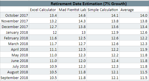 Nice increase on the net worth side, but didn’t translate much to any changes on this side. I’m thinking this may be the start of things flattening out? There was the fact that average expenses crept up, so the net worth increase probably wasn’t much to change that. We’ll see how this continues over the next few months, I might finally be settling in around 11-15 years depending on the growth rate.