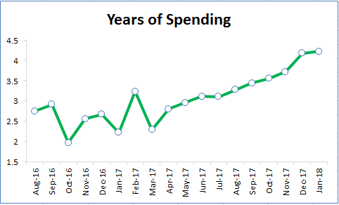 Relatively flat compared to last month, with spending decreasing slightly and my net worth increasing by around $1000. I was able to stay above that 4 year mark, and I’m hoping that I’ll be able to do that this month as well. The market has not been as kind in February so far, and I am planning on some large vacation spending in February and March.