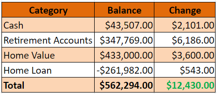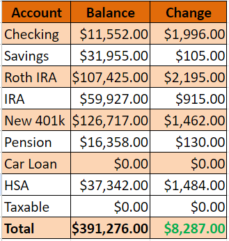 Like I said before, a solid month all around. Cash accounts had a nice increase and all my retirement accounts were positive.