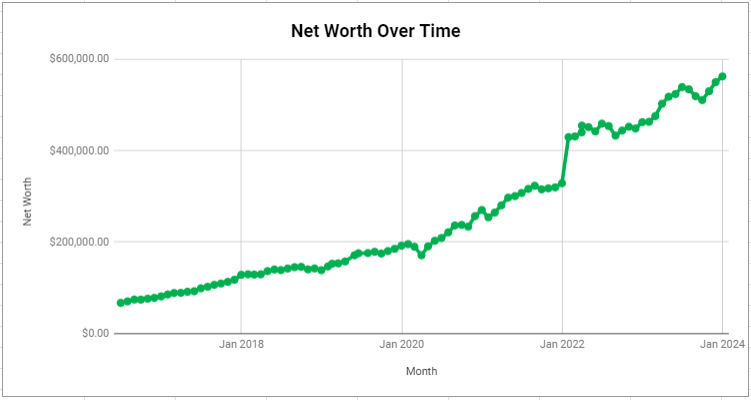 So while it was a month late, I was able to pass that $550,000 net worth stretch goal that I set for myself in 2023. I’m thinking that the goal for this year will be to hit $700,000 net worth by the end of the year. It’s a long shot for sure, but I think if the market cooperates I’m starting to really feel the power of compound interest on my side. There’s obviously a huge luck component to this target, but I think I have enough assets that with a solid market year it is achievable.