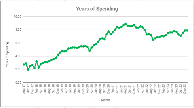 $391,276 net worth / $49,380 spending per year = 7.9 years’ worth of spending