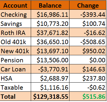 Both my Old 401k and Roth IRA both saw losses this month, though they weren’t as steep as the past month. We will see what the rest of April brings, but so far the market has been flat. My guess is that with contributions I will be able to slide past the 130,000 mark this coming month.