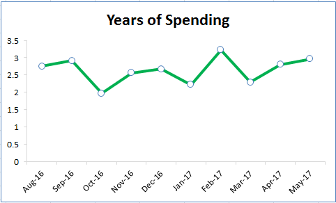 This is highest point I’ve had when doing this calculation, even if it’s only by a little bit! I’m thinking that by the next time I redo this exercise I should be able to hit 3 years worth of spending. I’m making that the goal for June’s summary, but we shall see.