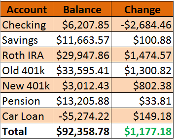 When I first running the numbers, I honestly thought I was going to be slightly negative or pretty much even compared to last month. So seeing the final results is a pleasant surprise even to me! I knew that I would have my current 401k contributions to help prop me up, but obviously that would have still put me at a slightly lower net worth because it’s still slow going with such a small balance.